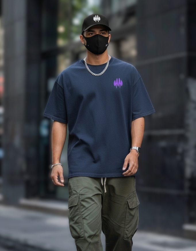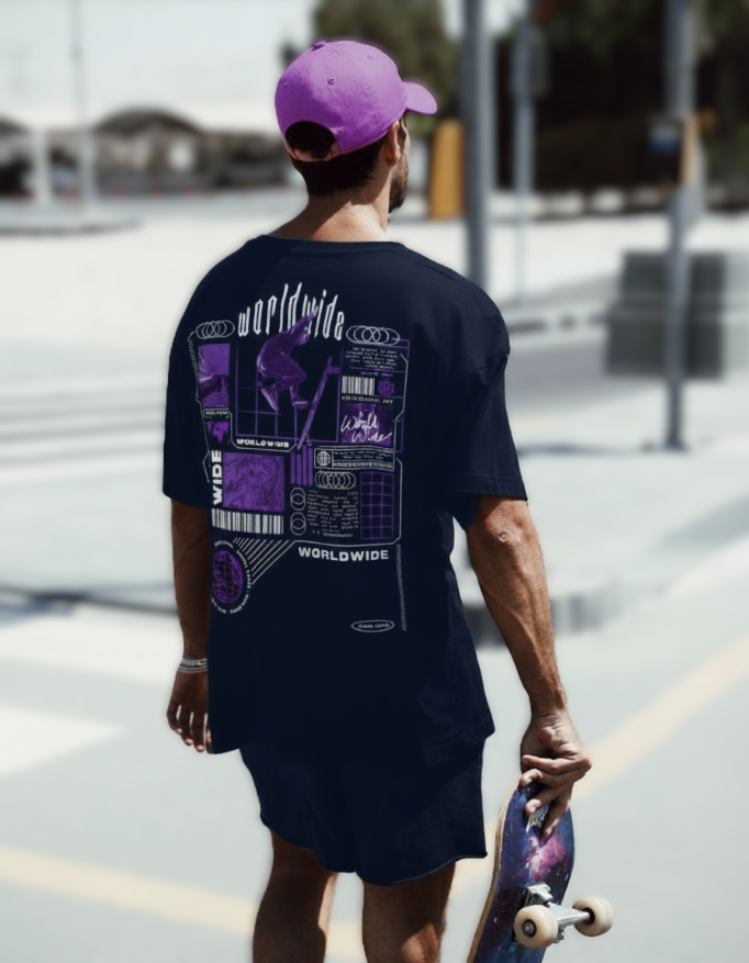 This navy blue Worldwide Tee is for those who refuse to be confined. They don't care about rules made by others – they make their own. They are born to break their boundaries. The electric purple graphic amidst "Worldwide" tags and digital aesthetics, embodies this boundless spirit. It's a testament to pioneers and rule-breakers. Echoing NVMN's "No Time For Average," this tee is your uniform for a life lived on your own terms, a constant reminder that you are limitless, and the world is your playground.